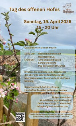 Herzliche Einladung zum Tag des offenen Hofes am 19. April 2026 von 15 - 20 Uhr mit abwechslungsreichen Rahmenprogramm wie einem Mitmachmärchen mit Märchenfee Lia oder Live-Musik mit Georg Schütz, kulinarische Köstlichkeiten und der Besichtigung unseres Hofgutes (Plakat in der Fußzeile unter Service/ Download).