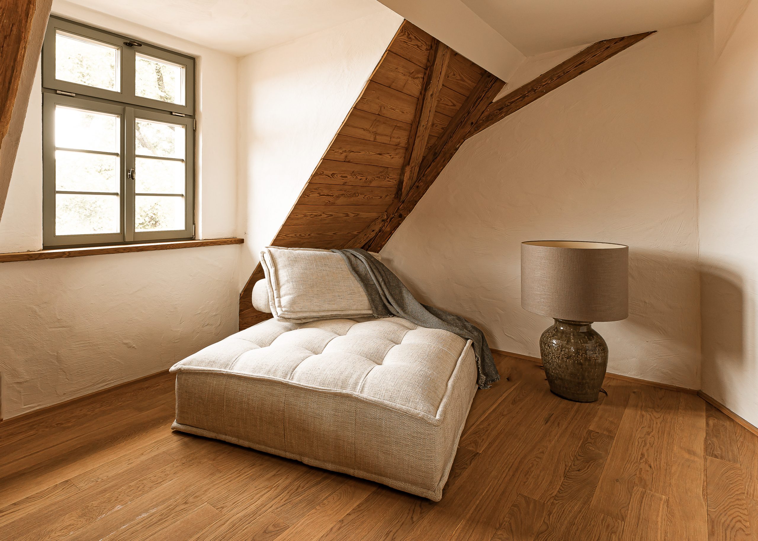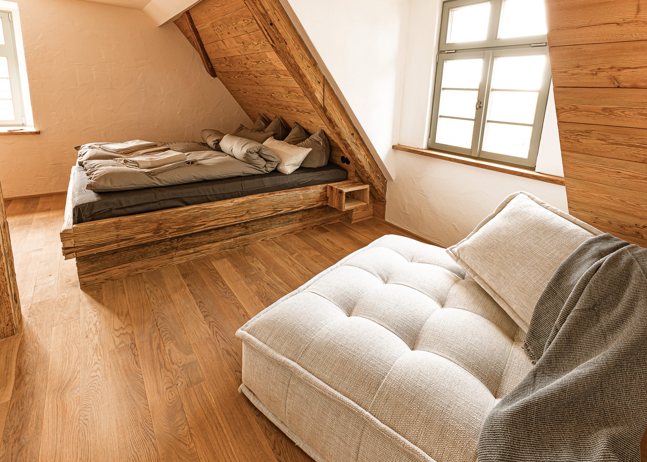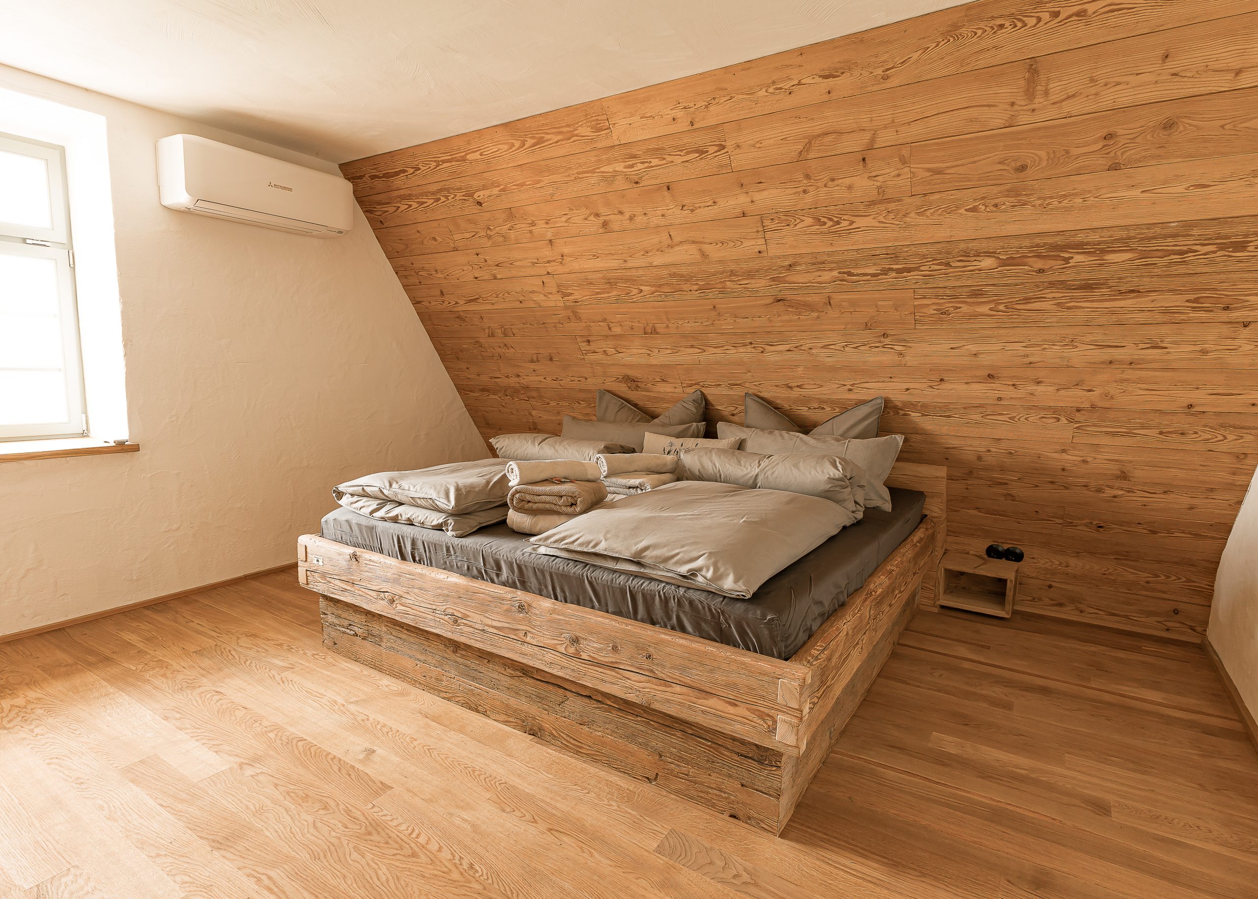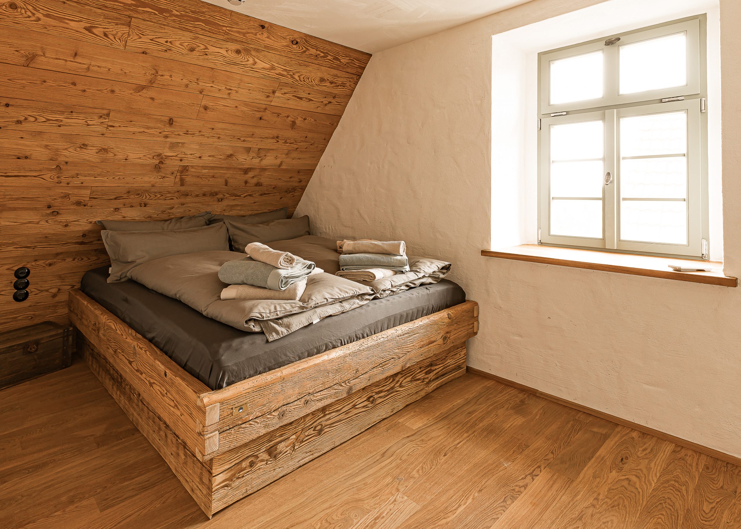 Lage der FeWo im Haus: Dachgeschoß / Spitzboden / offene Maisonette ein Schlafraum mit einem Doppelbett – 180×200 (2-Personen) ein Bad mit Dusche separate Badewanne …