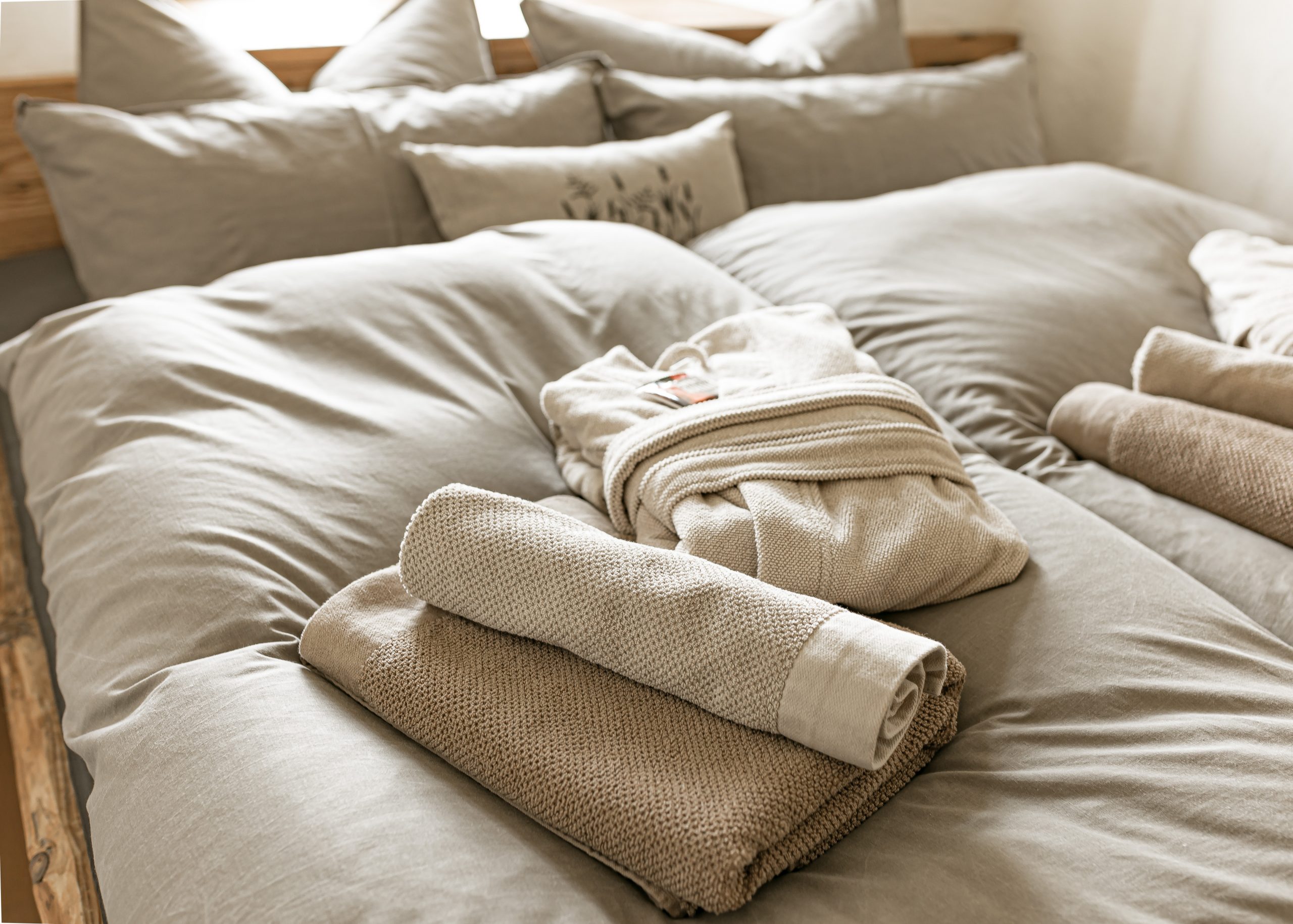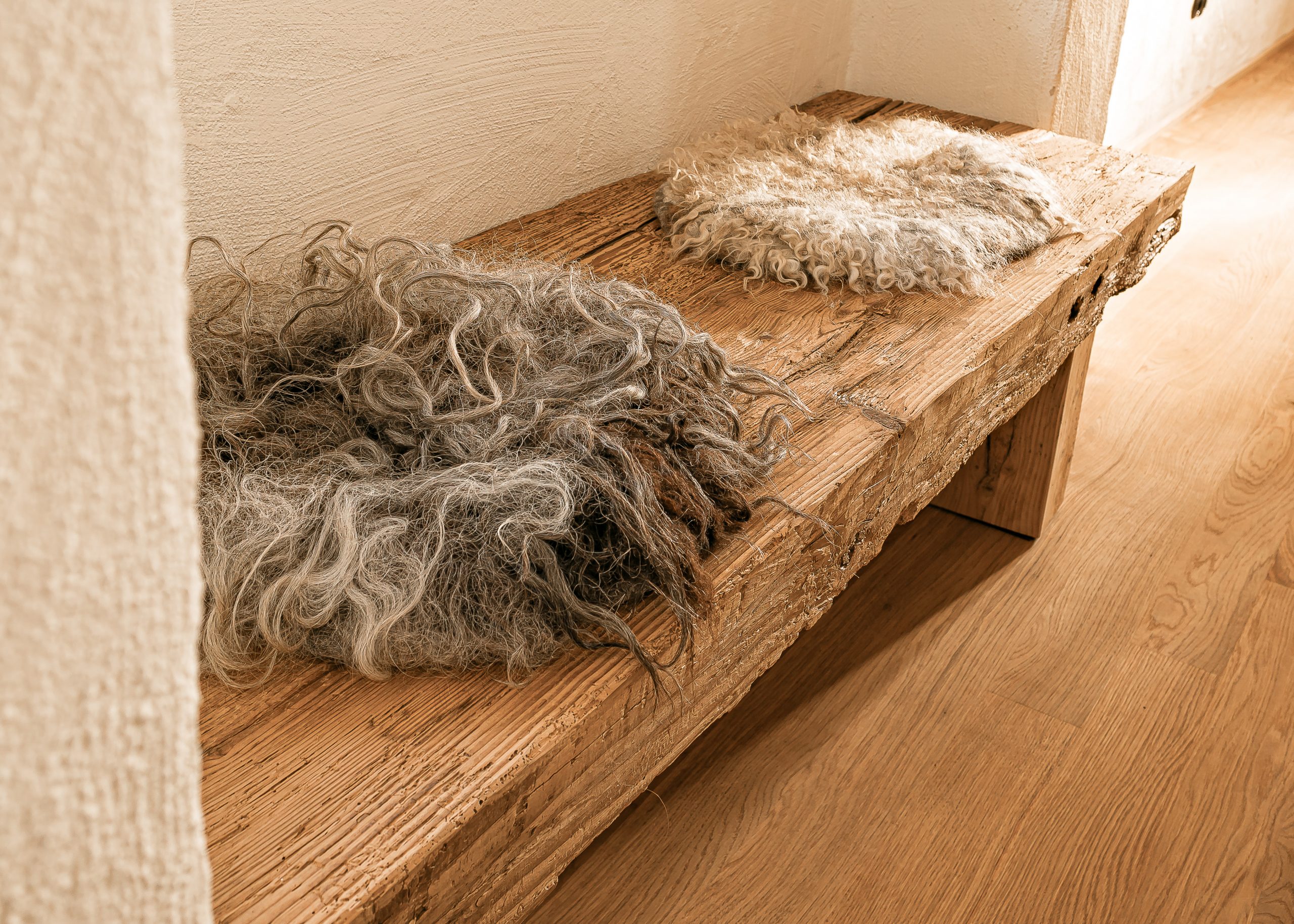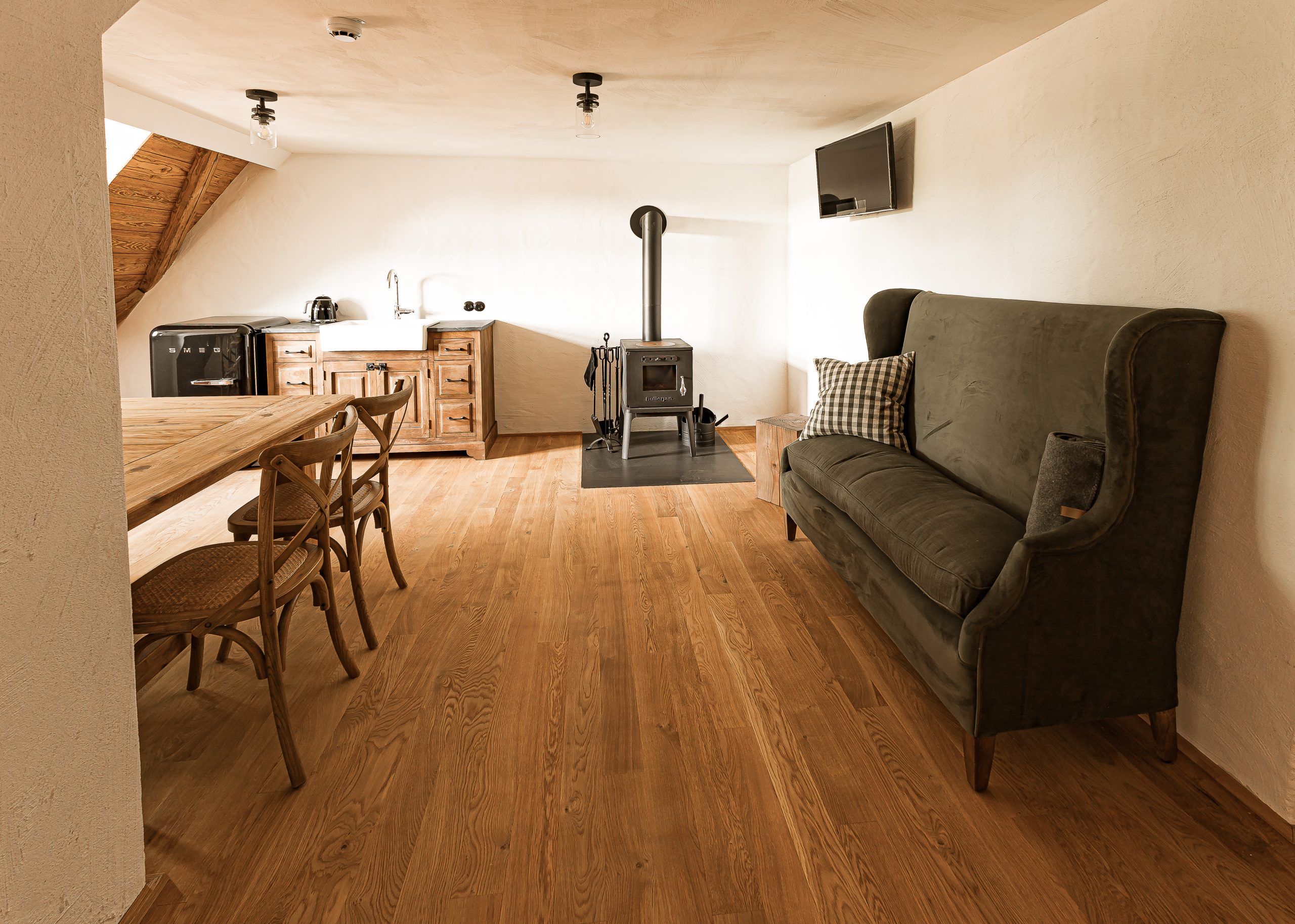 Lage der FeWo im Haus: Dachgeschoß zwei Schlafräume mit je einem Doppelbett 180×200 (2-Personen) zwei Bäder mit je einer Dusche Sofa / LED-Fernseher Essbereich Kamin …